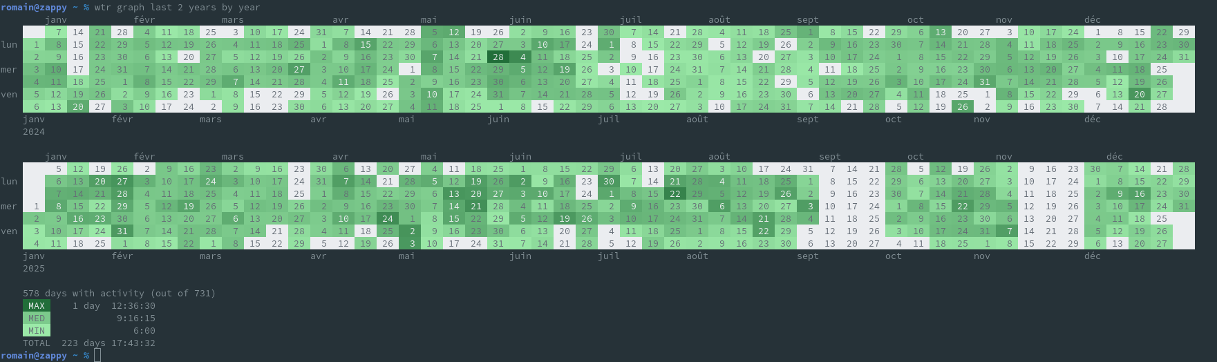 romain@zappy ~ % wtr on 2024-05-28 wtr since 2024-05-28 until 2024-05-29 Blogreen 5:44:20 Opus-Codium 16:28:30 Riemann 8:21:10 Vox Pupuli 5:59:10 --------------------------------- Total 1 day 12:36:30